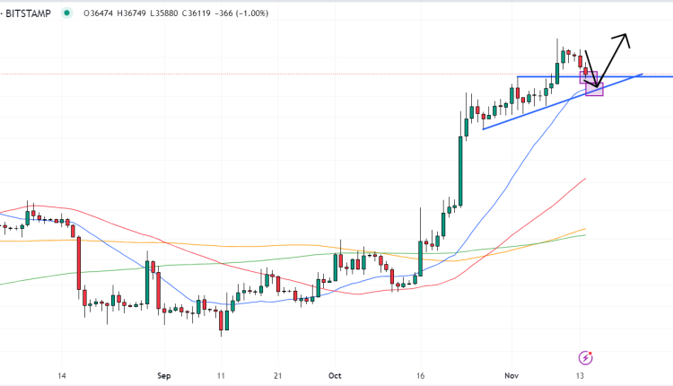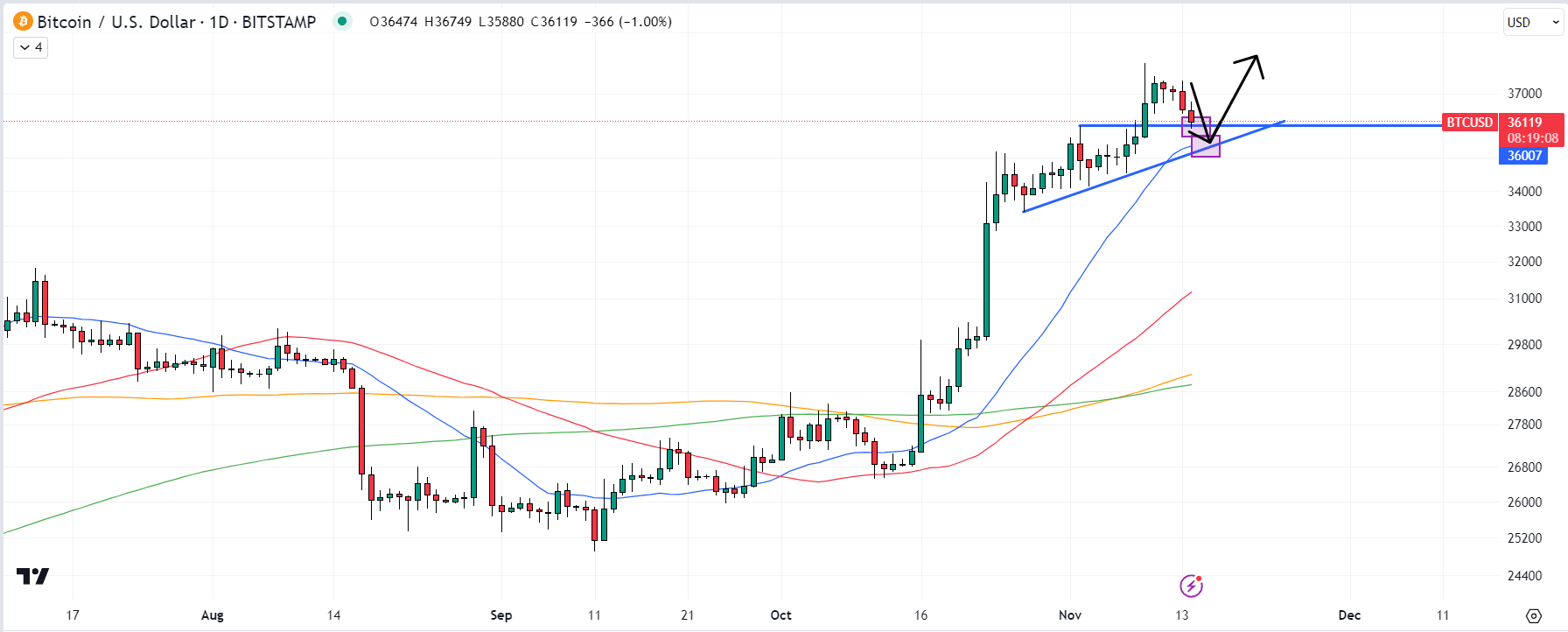 Bulls will be monitoring whether Bitcoin tests support in the form of early November highs at $36,000, or its short-term uptrend and 21DMA in the low $35,000s.