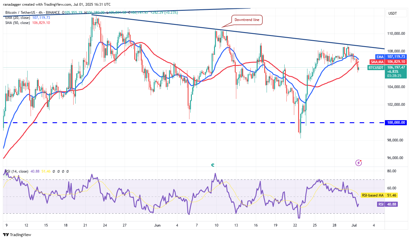 The upsloping moving averages signal a slight edge to the bulls, but the relative strength index (RSI) near the midpoint suggests a lack of bullish momentum. If the price slips and sustains below the moving averages, the BTC/USDT pair could slump to $104,500 and below that to $100,000. Such a move retains the pair inside the bearish descending triangle pattern.