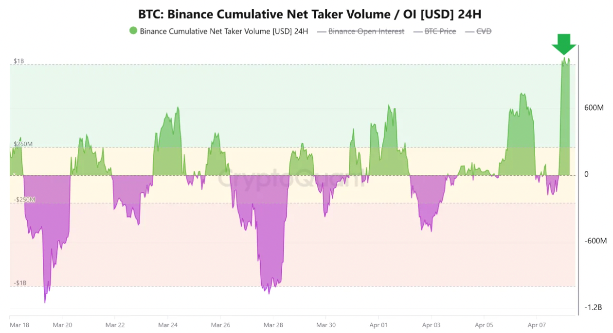 The Binance Bitcoin cumulative test taker volume has “climbed to $1.02 billion, its highest level since March 17, signaling a sharp return of aggressive buying in Bitcoin,” CryptoQuant analyst Amr Taha said, adding: