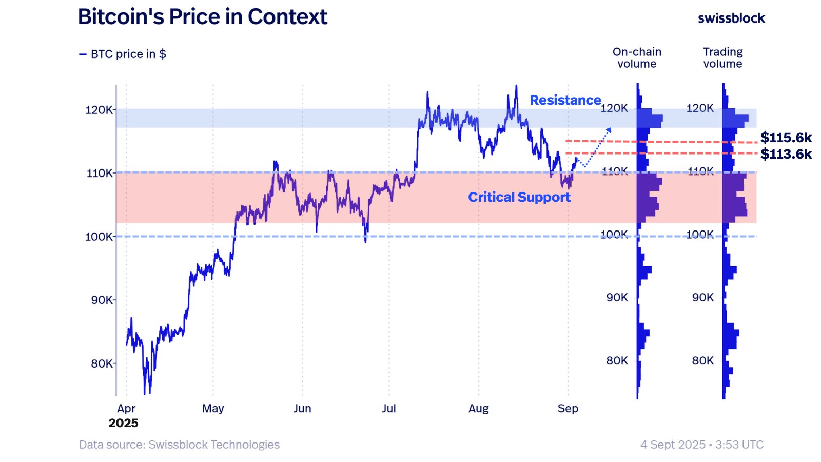 “Above, there is the $113.6K–$115.6K gate. After a pullback, price needs fresh momentum to clear it, then contend with heavy resistance into $118K.”