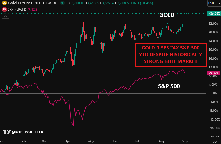 Gold futures vs. S&P 500 chart. Source: The Kobeissi Letter/X