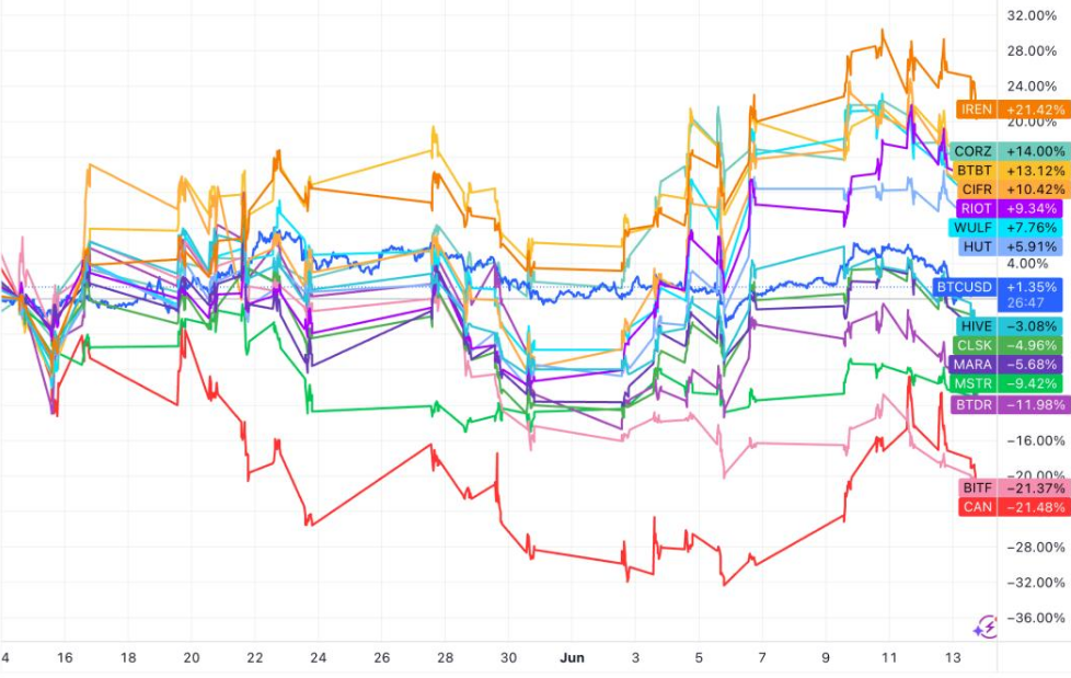While Bitcoin increased 1.35% between May 4 and June 13, IREN (IREN) soared 21.4% over the same time frame, with Core Scientific (CORZ), Bit Digital (BTBT), and Cipher Mining (CIFR) also posting double-digit gains.
