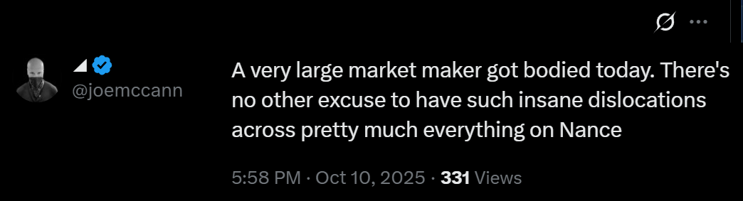 Joe McCann, founder and CEO of Asymmetric Financial, said on X that “a very large market maker” must have been wiped out during Friday’s crash, which would explain the sharp price gaps across exchanges and the “insane dislocations” on Binance. Even if these assumptions prove short-lived, traders will likely wait longer before re-entering the cryptocurrency market.