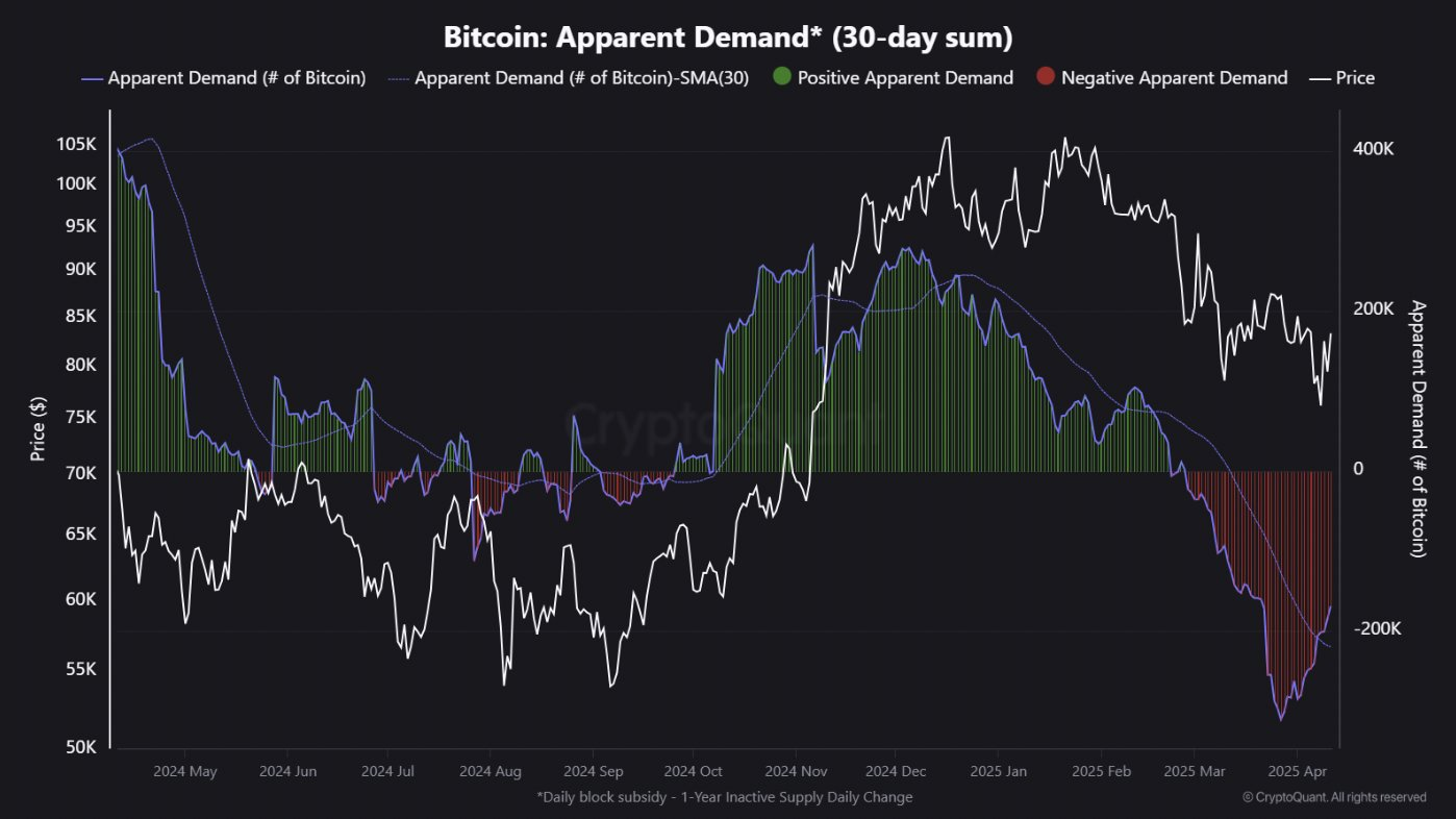 According to CryptoQuant, Bitcoin’s apparent demand — measured by the 30-day net difference between exchange inflows and outflows — is showing early signs of recovery after a sustained dip into negative territory.