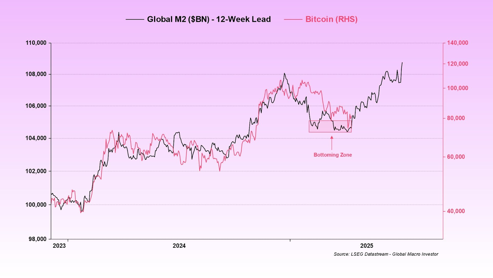 Yet, on a broader macroeconomic level, some analysts see reasons for cautious hope. Independent market analyst Michael van de Poppe pointed out the quickly rising M2 Supply, which, with a certain lag (here 12 weeks), has often influenced Bitcoin price in the past.