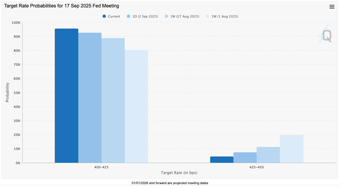 Data from CME Group’s FedWatch Tool confirms that market expectations of an interest-rate cut in September are now over 95%.