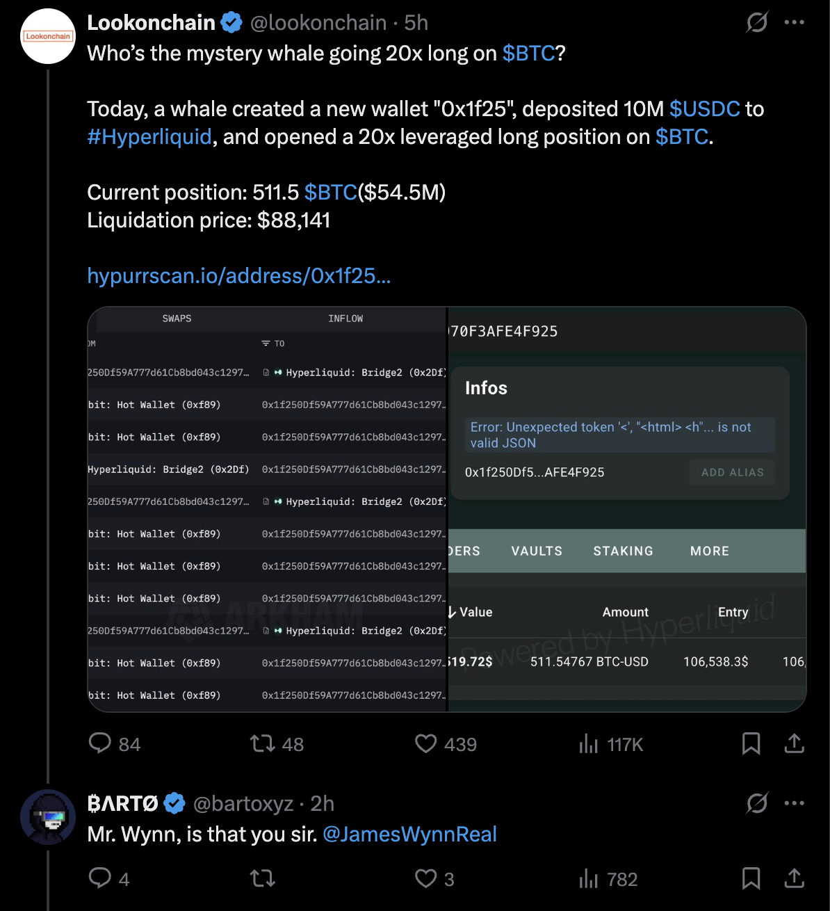 The trader then opened a 511.5 BTC position on the decentralized exchange Hyperliquid, using full cross-margin leverage.