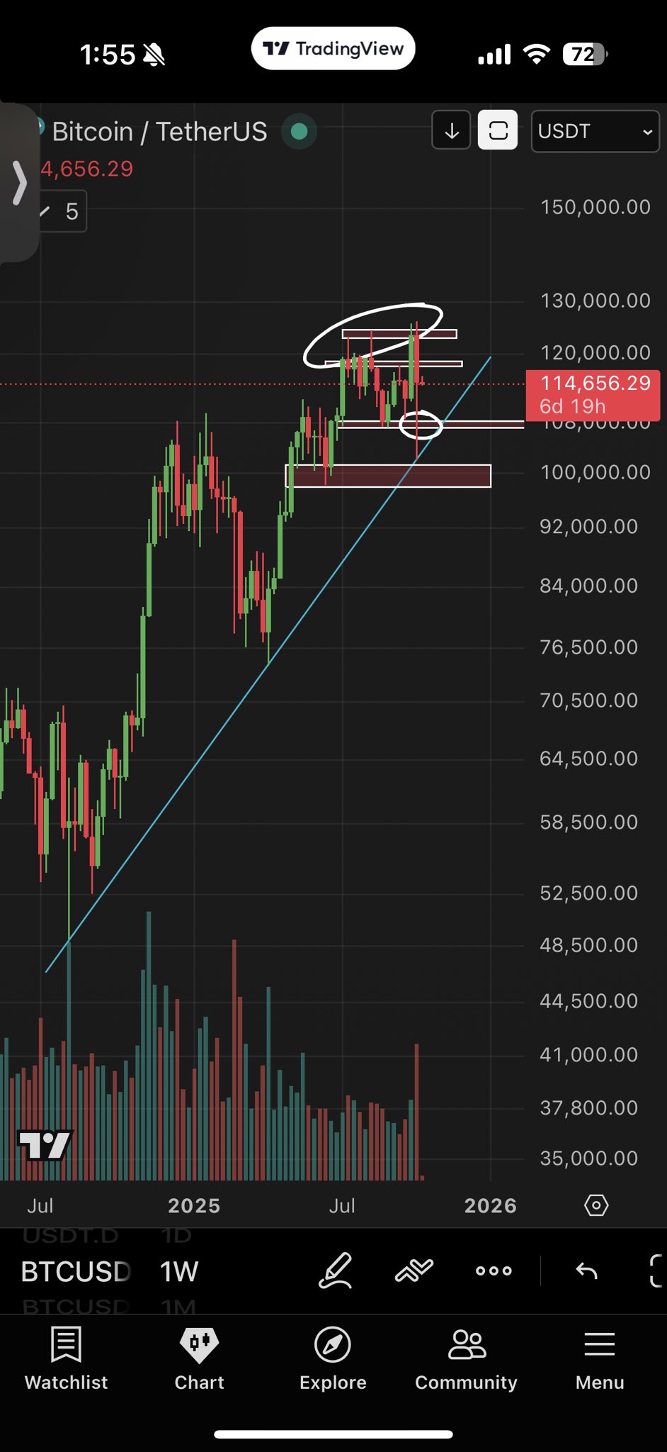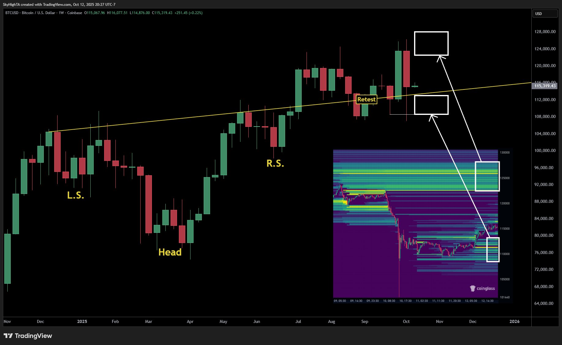 “Tradfi may need a chance to retest the lows, and there is liquidity from 108.5 to 113 with concentration near the mid 111’s. The hot spot overhead is from 123-128 with concentration around the $126K ATH.”