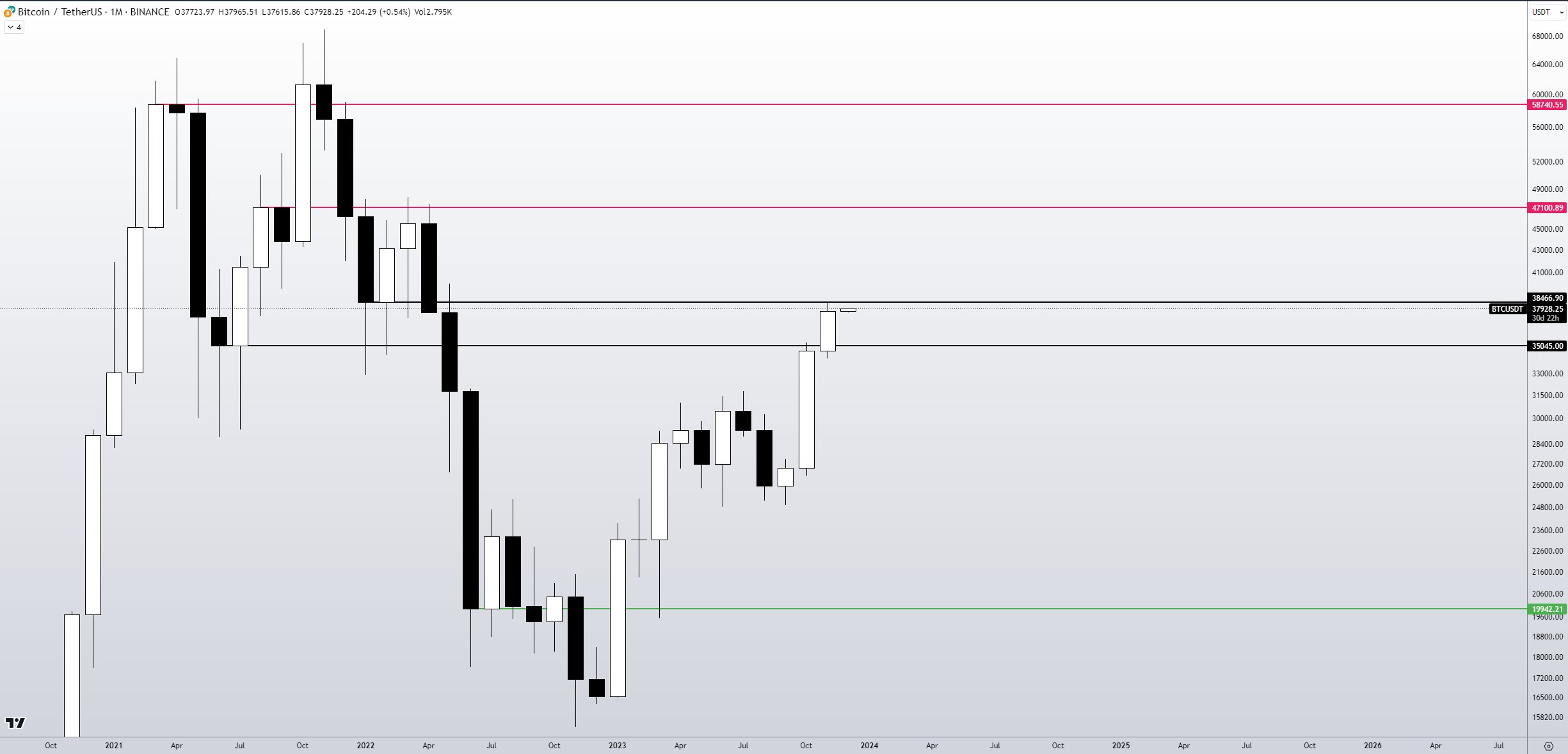 “Monthly candle was excellent with a candle body low of $34.5K, this is important in that the lower candle BODY low was higher then the preceding candle BODY high. This is a sign of strength!” fellow trader and chartist JT continued in part of his own summary.