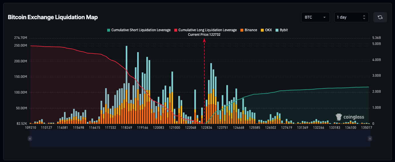 Liquidation heatmap data from Hyblock shows Bitcoin pushing through a short liquidation cluster starting at $122,500, with room for further forced closure of positions extending to $124,000. Data from CoinGlass suggests that nearly $2 billion in short positions are at risk of liquidation if traders push BTC price through the $122,800 to $125,500 liquidity cluster.