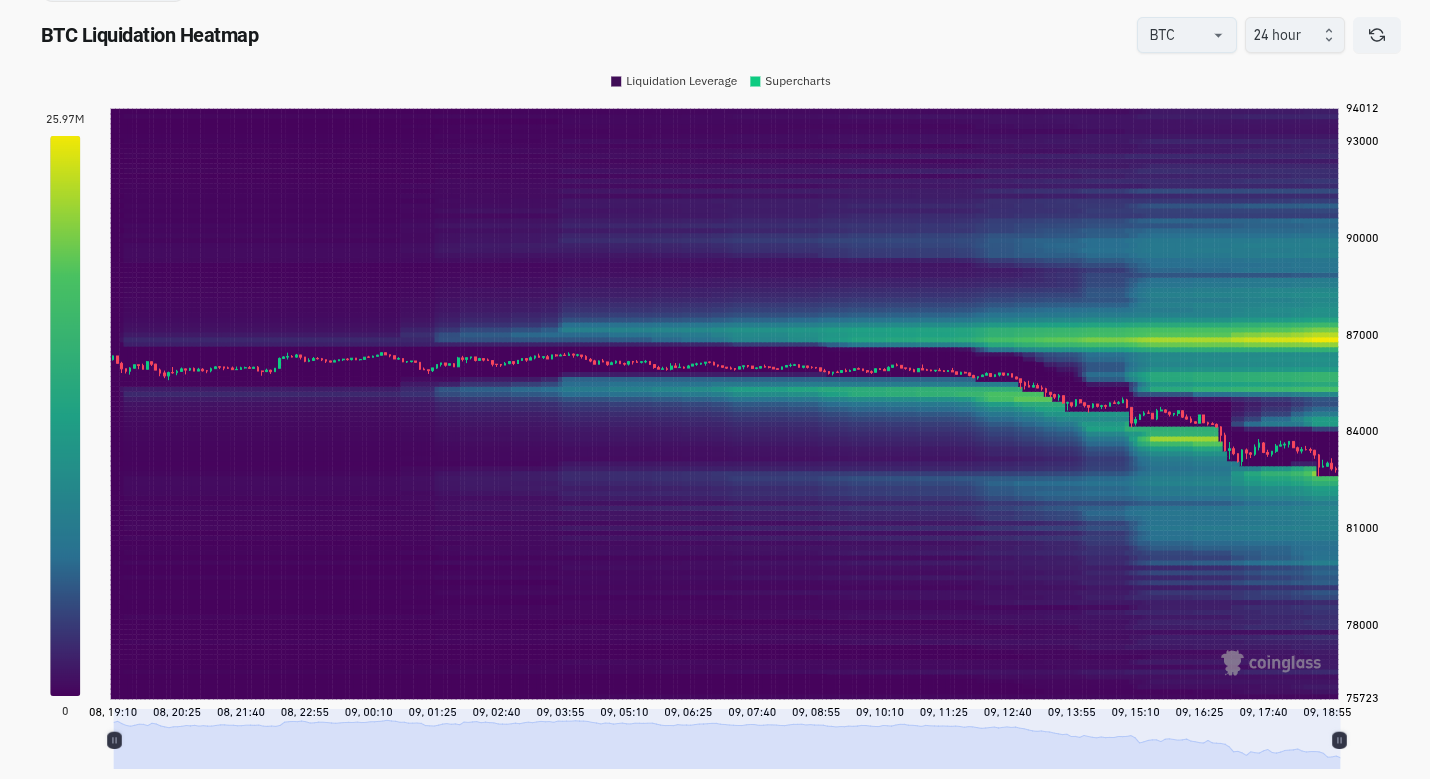 The thickest bid liquidity across exchanges stood at just below $83,000 at the time of writing, with the spot price dangerously close to breaking lower.