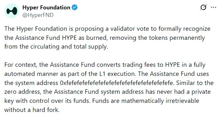 The Hyper Foundation proposed a validator vote to formally recognize HYPE tokens held in the Hyperliquid protocol’s Assistance Fund system address as permanently inaccessible, excluding them from the asset’s circulating and total supply.