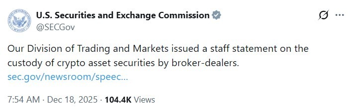 The US Securities and Exchange Commission’s Trading and Markets Division on Wednesday laid out how broker-dealers can custody tokenized stocks and bonds under existing customer protection rules, signaling that blockchain-based crypto asset securities will be slotted into traditional securities safeguards rather than treated as a new category.