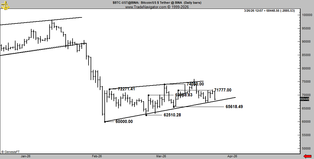On longer time frames, market participants focused on a potential bearish support breakdown from Bitcoin’s second bear flag construction of 2026.