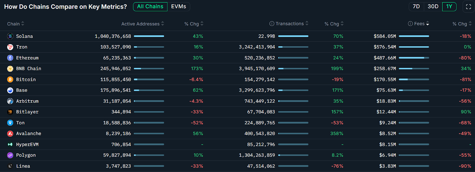 Looking at the past year, Solana was the leading blockchain by fees, with $585 million generated, while second was Tron with $576 million in revenue, according to crypto intelligence platform Nansen.