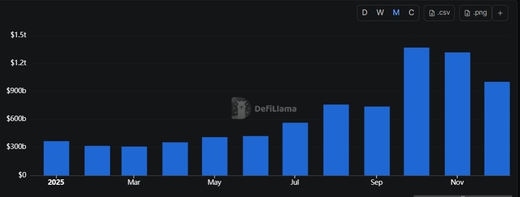In December alone, perpetuals trading volume reached $1 trillion, carrying momentum that started in October, when monthly volumes first reached $1 trillion.
