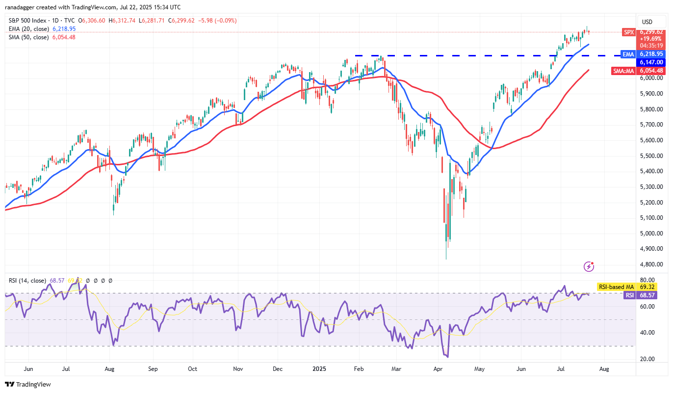 The S&P 500 Index (SPX) turned up from the 20-day exponential moving average (6,218) on Wednesday, indicating buying on dips.
