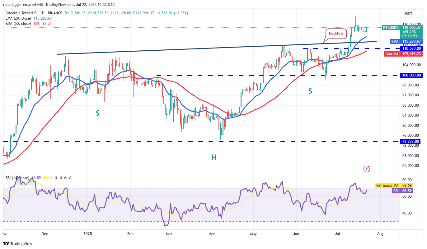 The upsloping 20-day EMA ($115,289) and the RSI in the positive zone signal that the path of least resistance is to the upside. If buyers kick the price above $123,218, the BTC/USDT pair could pick up momentum and surge to $135,729 and, after that, to the pattern target of $150,000.