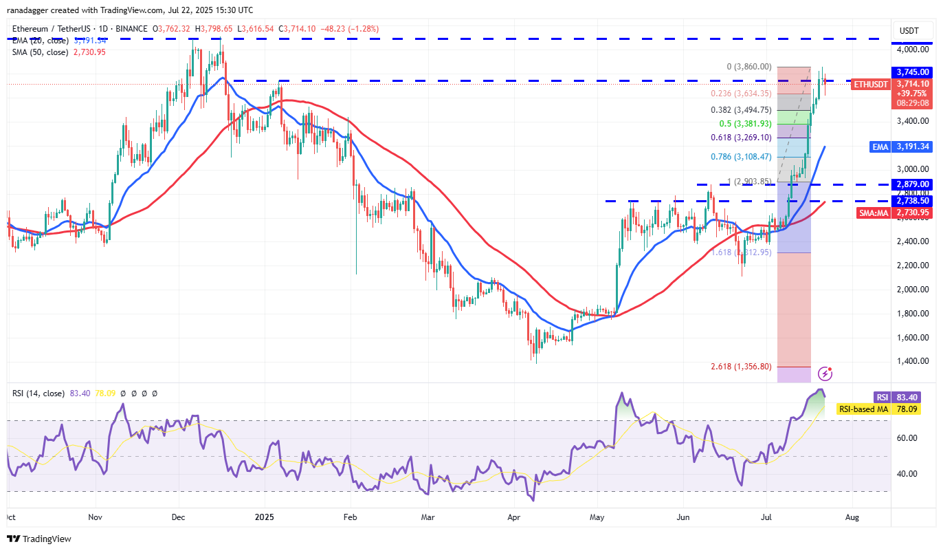 Ether rose above the $3,745 resistance on Sunday, but the bulls could not sustain the breakout.