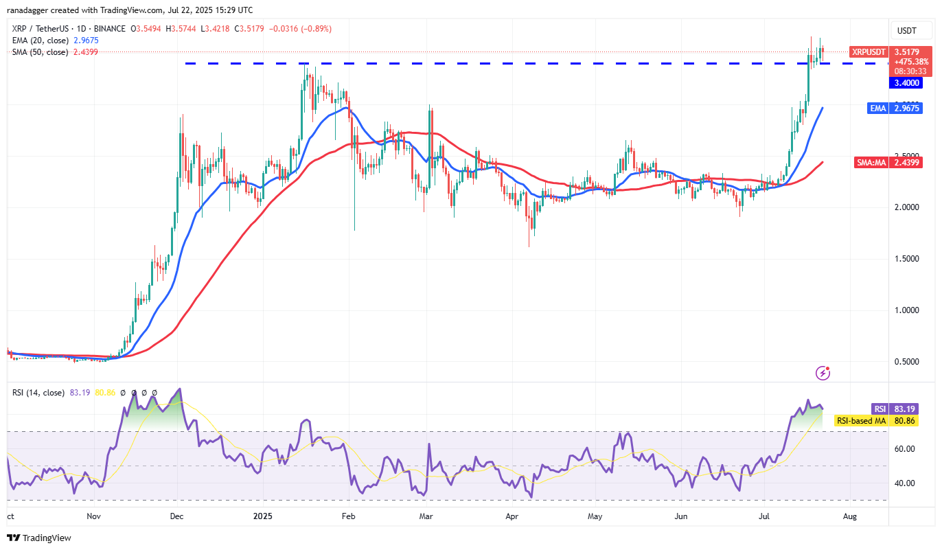 XRP (XRP) soared above the $3.40 resistance on Thursday, and the bulls have successfully maintained the price above the breakout level. That suggests the buyers are trying to flip the $3.40 level into support.