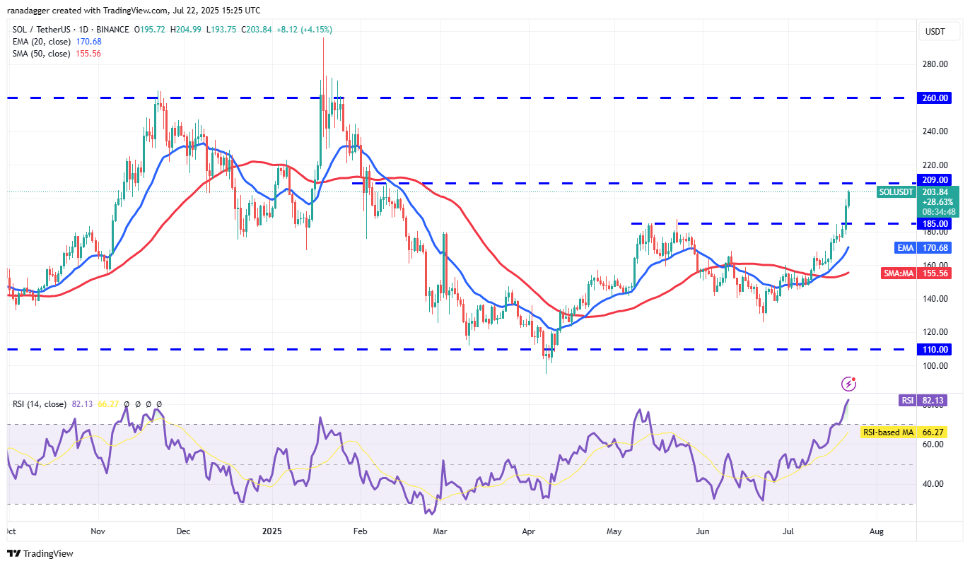 Solana (SOL) skyrocketed above the $185 overhead resistance on Monday, and the bulls are trying to strengthen their position by pushing the price above the $209 resistance.