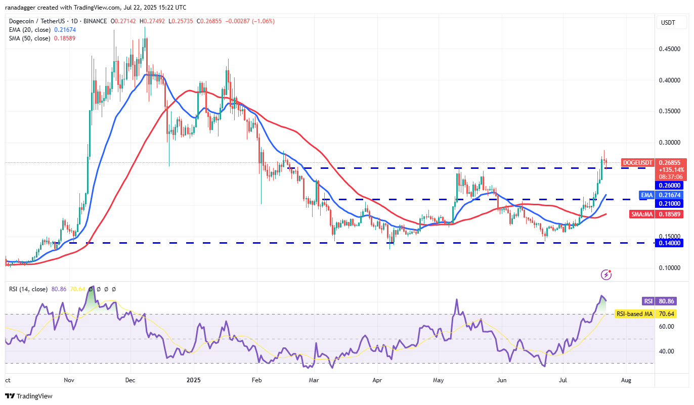 The bears are trying to pull the price back below $0.26. If they manage to do that, the aggressive bulls may get trapped. The DOGE/USDT pair could then dip to the 20-day EMA ($0.21), which is likely to attract buyers.
