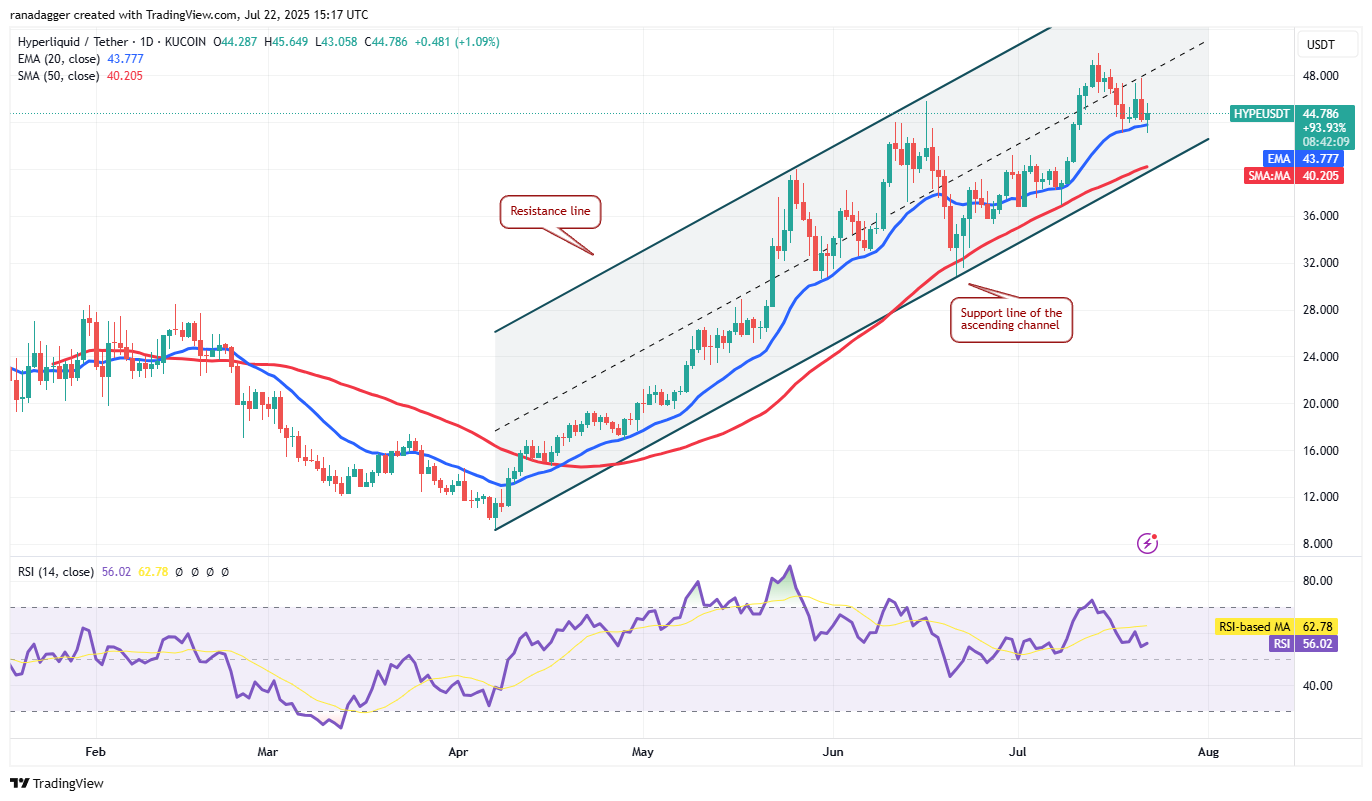 That indicates profit-booking on rallies. The bears are trying to pull the price below the 20-day EMA. If they manage to do that, the HYPE/USDT pair could plunge to the support line of the ascending channel.