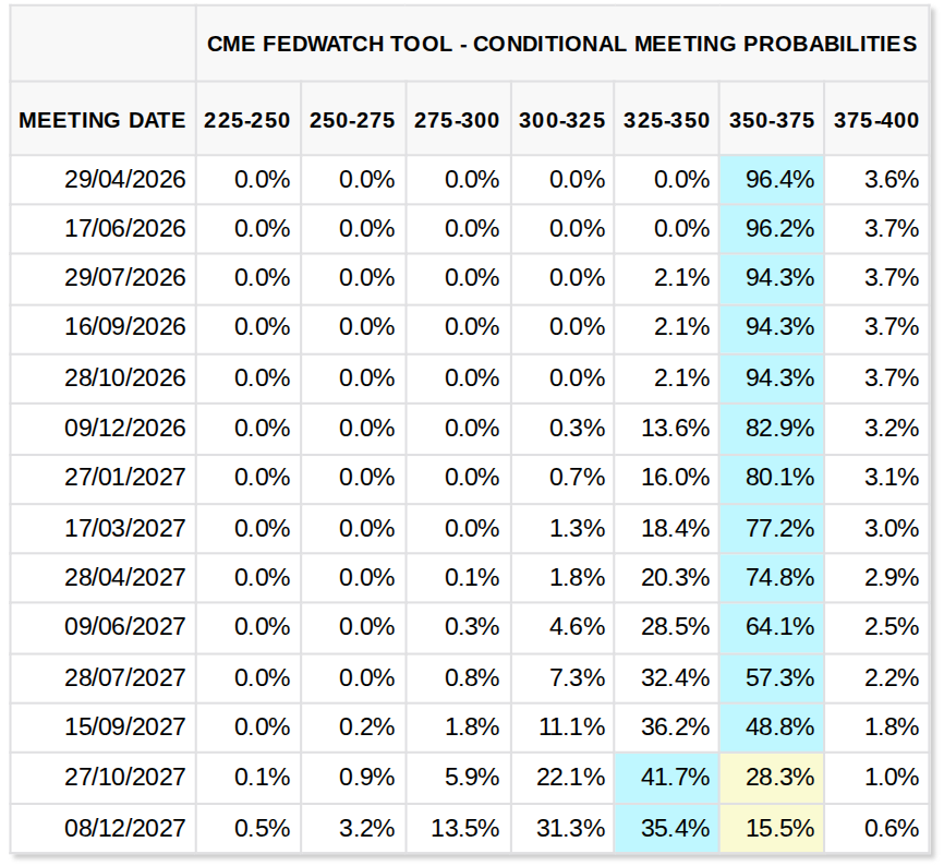 The latest data from CME Group’s FedWatch Tool shows that markets already see no rate cuts coming before the second half of 2027.