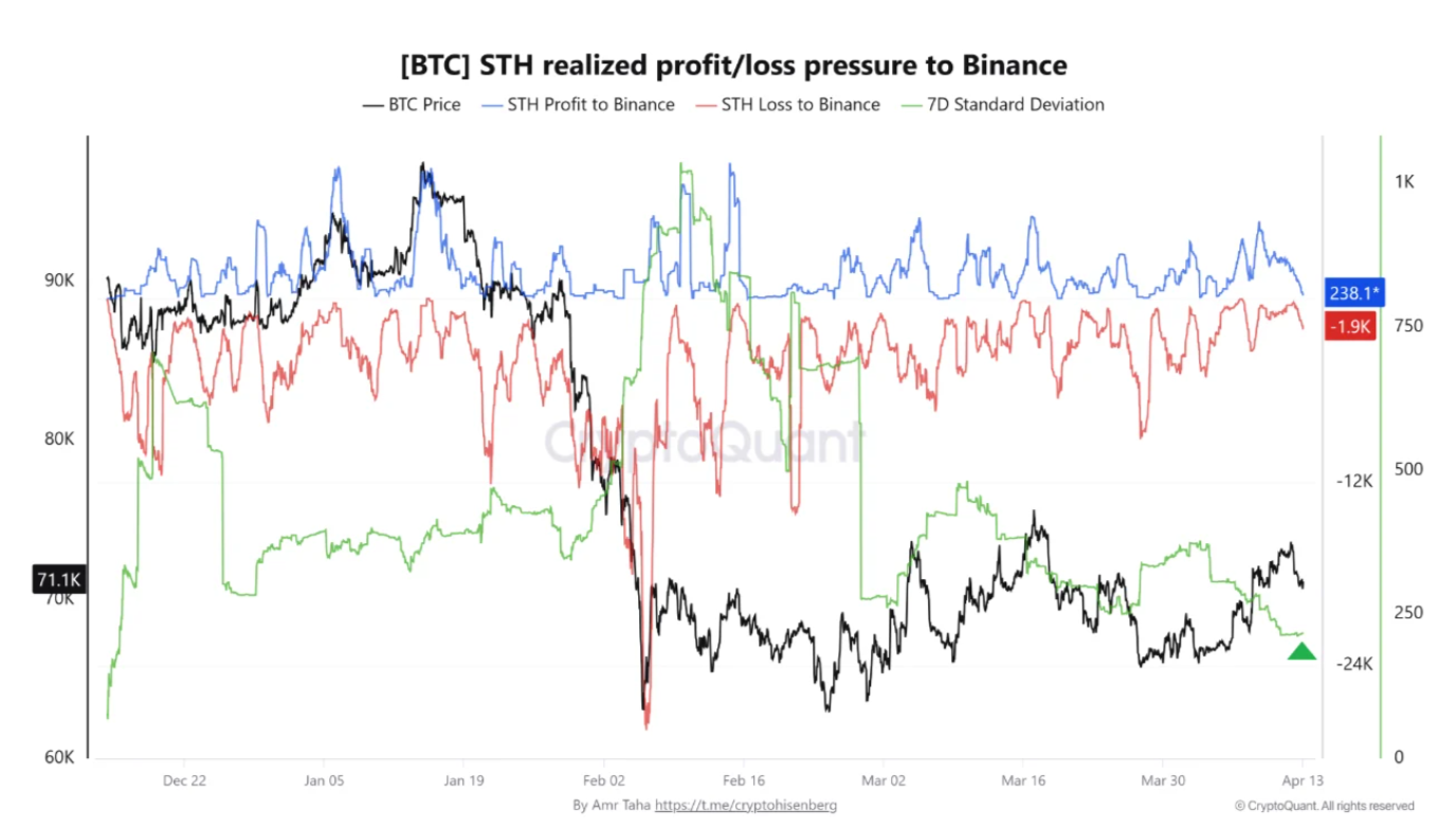 “The move signals that short-term holders are sending coins to Binance with less aggressive profit-taking and less panic-driven loss realization, reducing near-term distribution pressure on the market.”