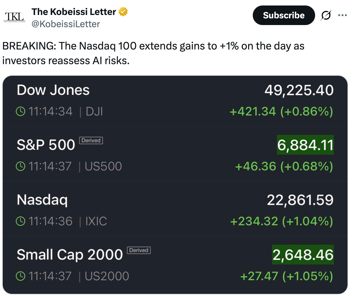Bitcoin’s recovery Wednesday aligns closely with similar rebounds in the US stock market, with AI and tech stocks leading the market higher.
