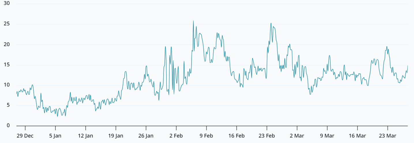 On Friday, the April 24 Bitcoin $66,000 put (sell) options traded at 0.0566 BTC or roughly $3,730. With a 53% implied probability of Bitcoin trading below $66,000 by late April, the mood remains decidedly bearish following the increased uncertainty in the US and Israel-Iran war, pushing traders into a risk-averse mode.