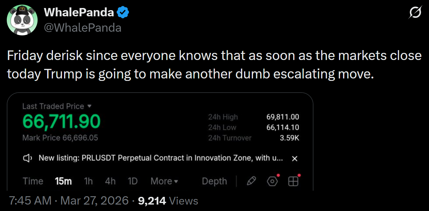 X social platform user WhalePanda, suggested that the crash in risk markets anticipates President Trump making “another dumb escalating move” after US markets close. Consequently, the current fear seen in the options market could reverse if no major geopolitical events occur before Monday.