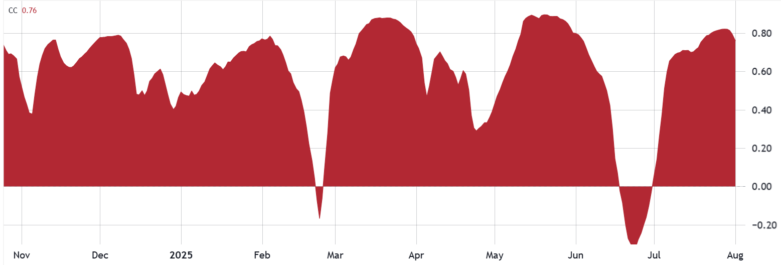 After a short period in late June when Bitcoin moved differently from the S&P 500 index, the correlation between the two has climbed above 70% in the past three weeks. Instead of acting as “digital gold,” Bitcoin is now trading more like a high‑risk tech stock. This may also explain why its $2.3 trillion market value is close to that of Amazon or Google.
