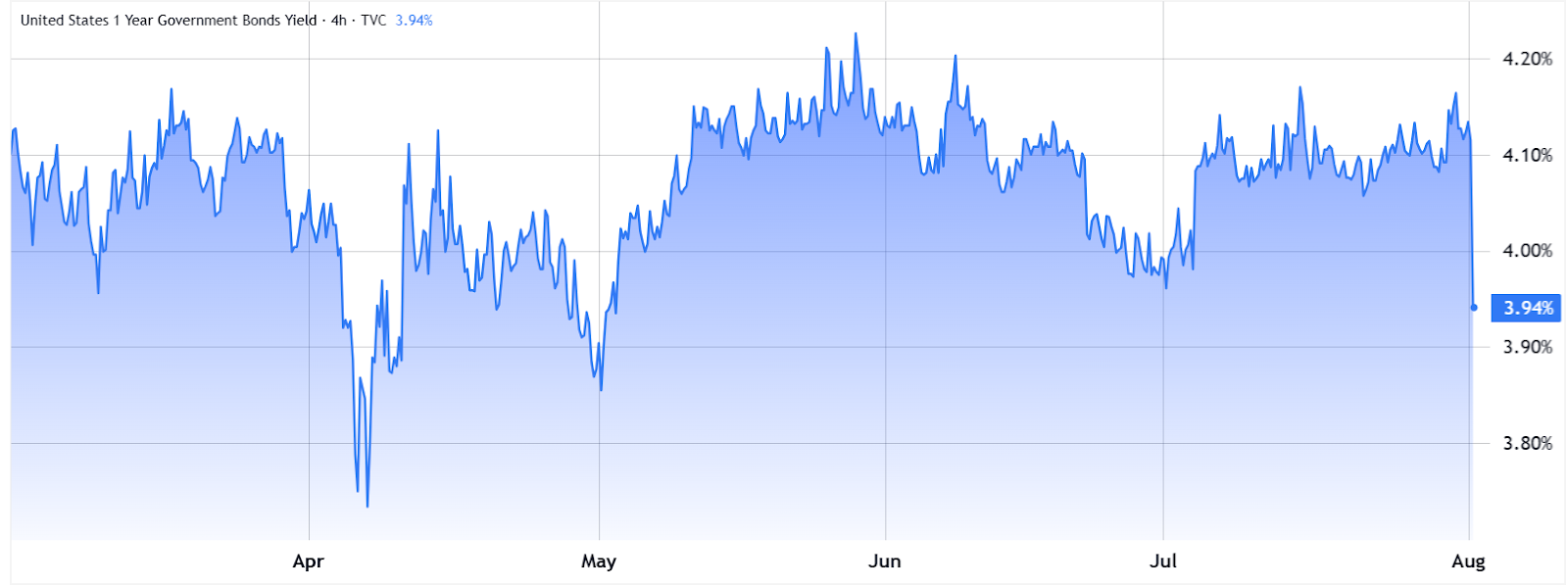 Demand for the 1‑year US Treasury has reached its highest level in three months, with investors accepting lower yields. This happened as the US Bureau of Labor Statistics revised May and June job reports downward, while unemployment rose to 4.2% in July from 4.1% a month earlier.