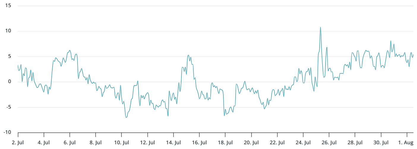The current 5% delta skew between puts and calls is on the edge between neutral and bearish sentiment, a stance that has held since Wednesday. This marks a full reversal from July 18, when the skew was leaning toward bullishness. The higher cost of downside protection indicates weaker confidence in the $114,000 support level.