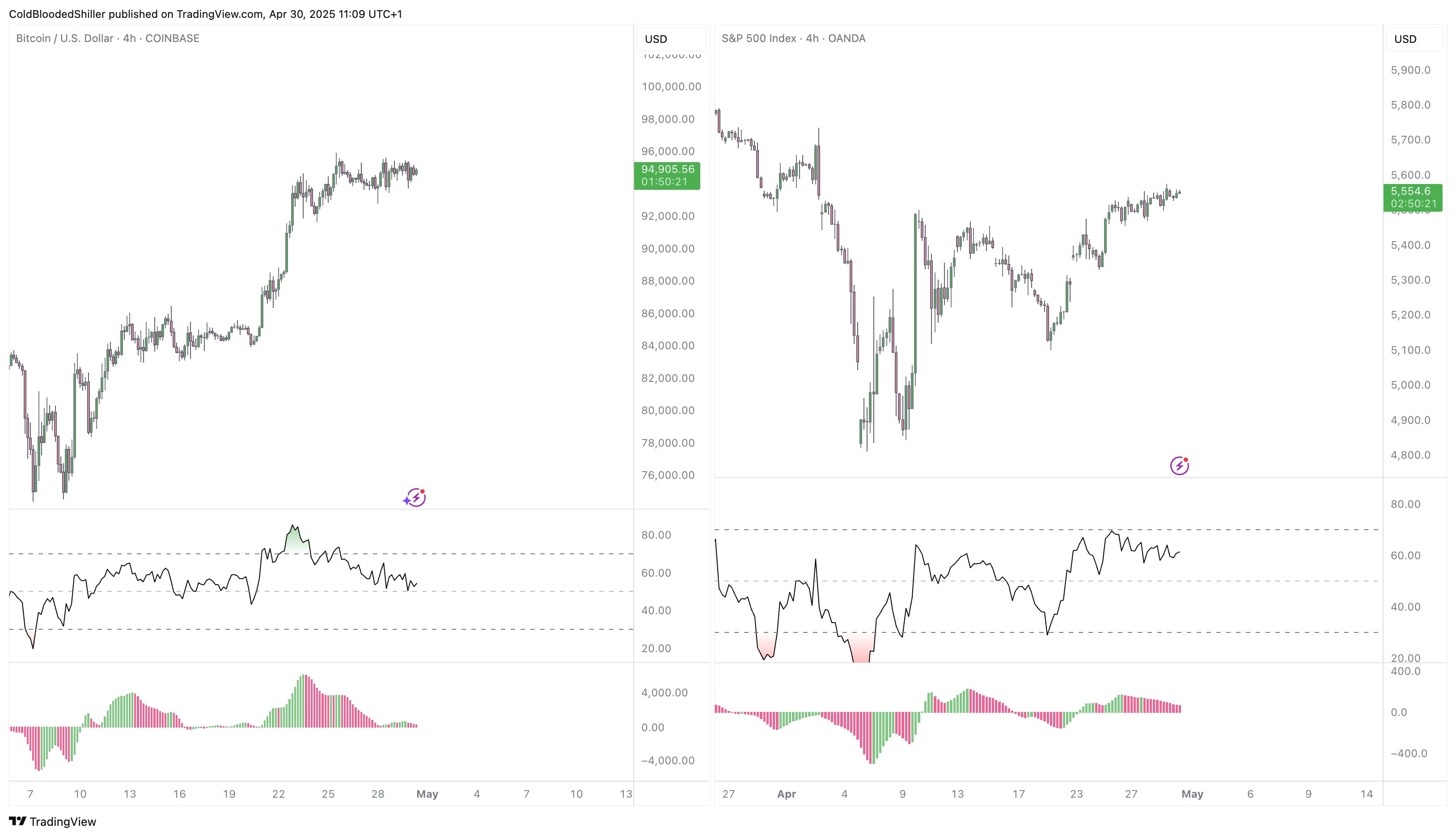 “It’s going to be decision time for $BTC and $SPX I’d imagine within the next 24 hours,” popular trader Cold Blooded Shiller argued.