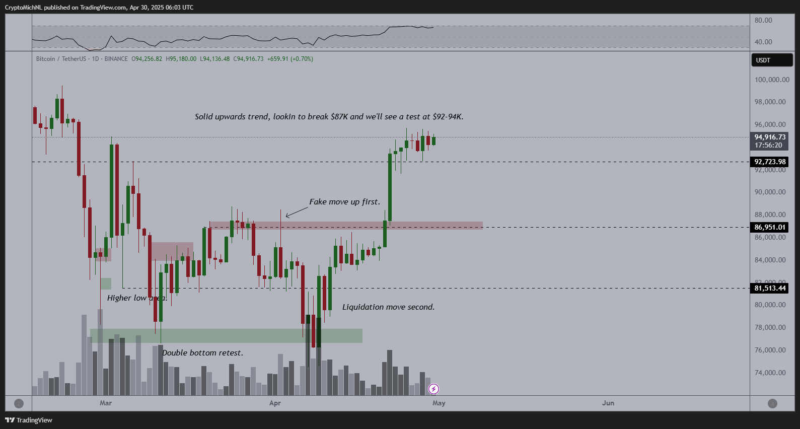 “A Monthly Close like this would solidify Bitcoin’s position at these highs, even if downside wicking below $93300 could still occur in May (similar to Dec 2024 or Jan 2025 wicks).”