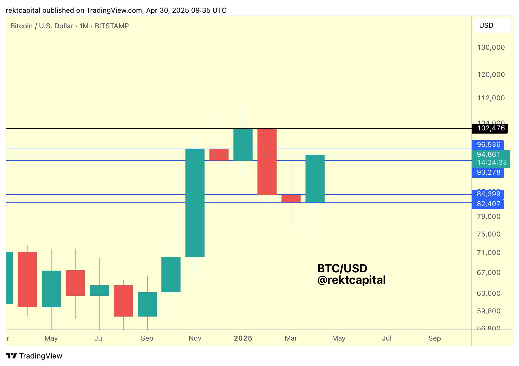 “Bitcoin is on the cusp of a Monthly Close in the $93300-$96500 Monthly Range,” popular trader and analyst Rekt Capital commented in an X post on the topic.