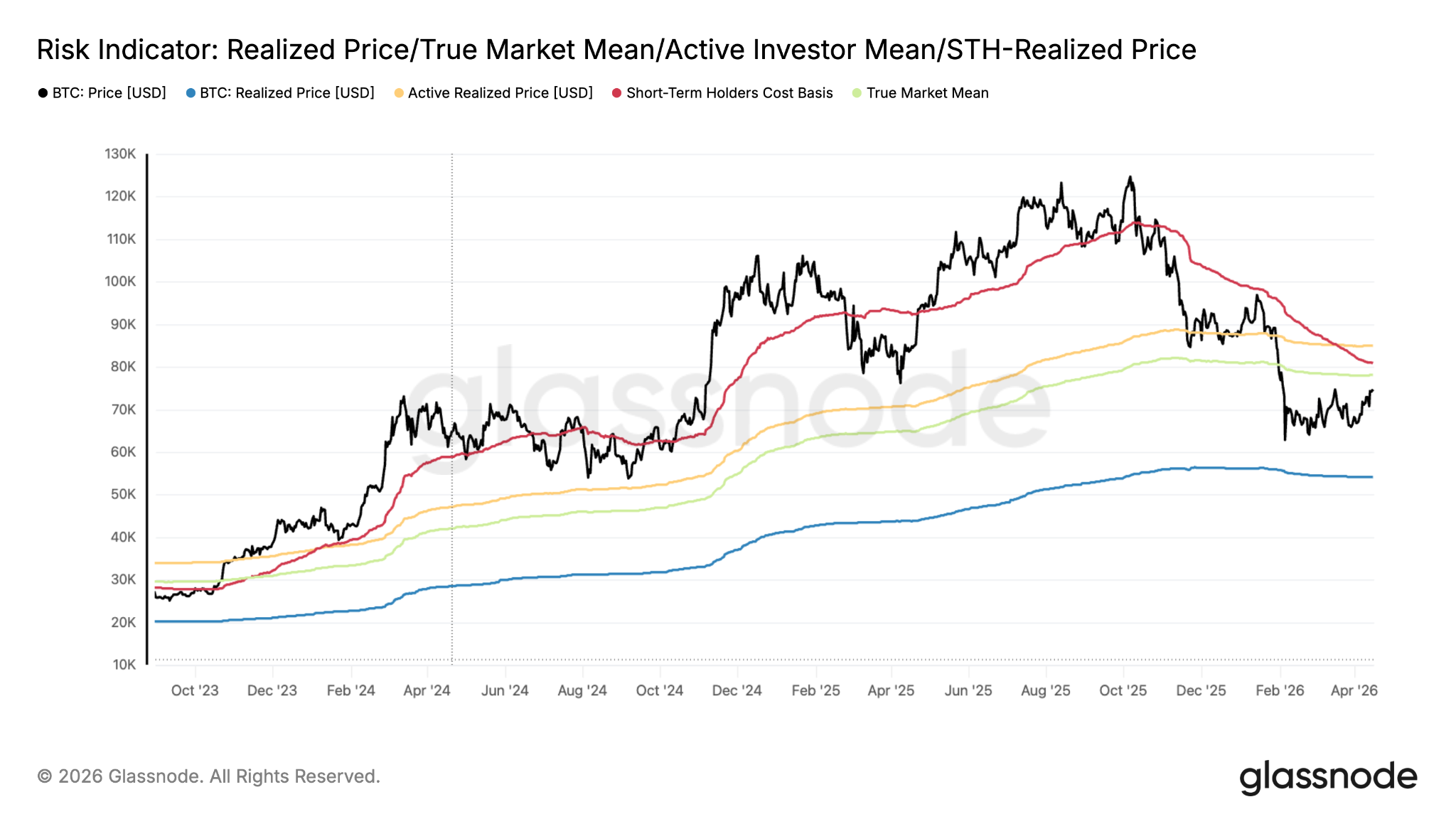 At $74,000, Bitcoin is 5.2% below the true market mean, a metric tracking the cost basis of active BTC supply.