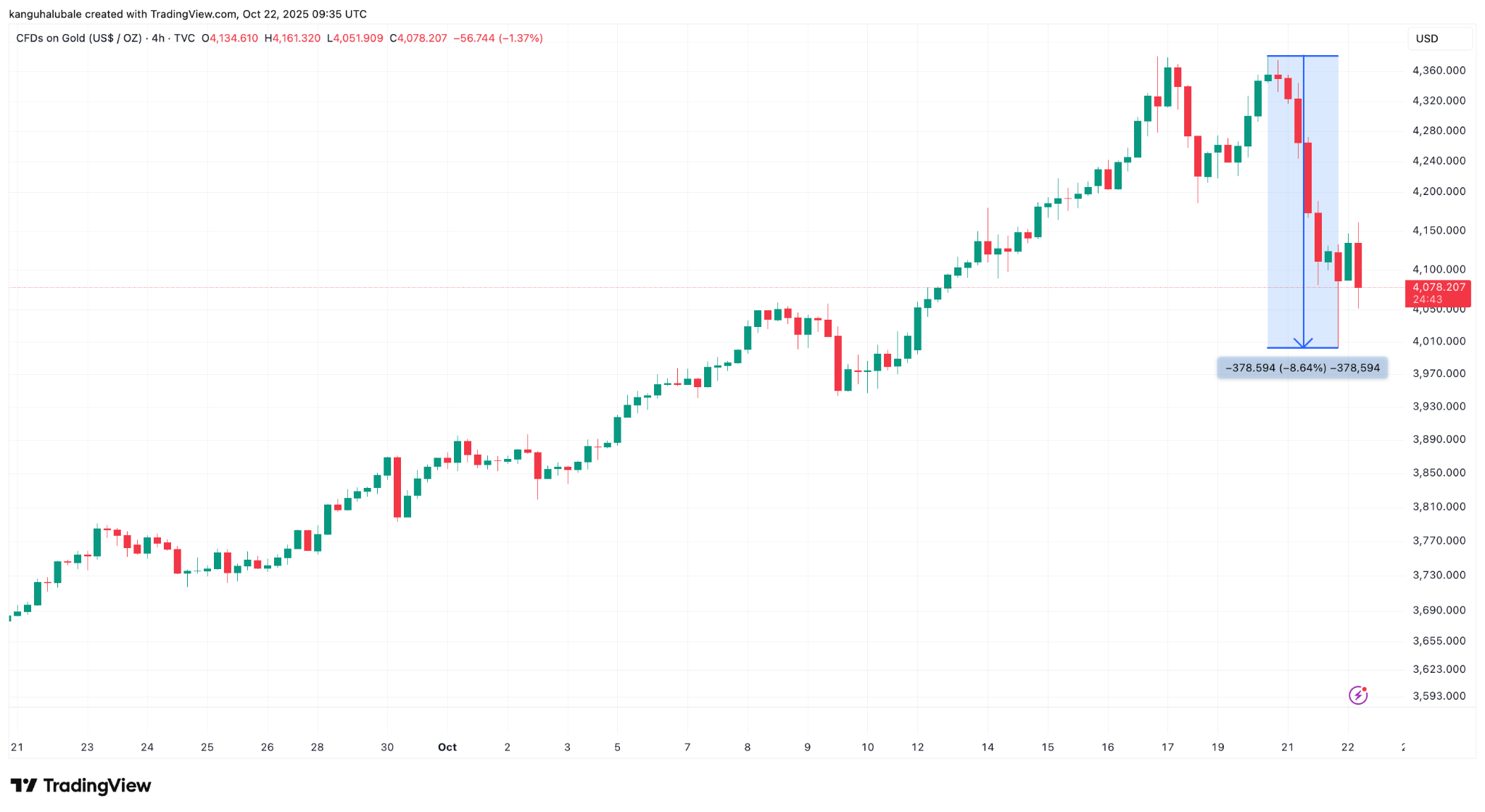 Data from Cointelegraph Markets Pro and TradingView revealed that gold is down 8.5% from its all-time high of $4,380 reached on Monday.