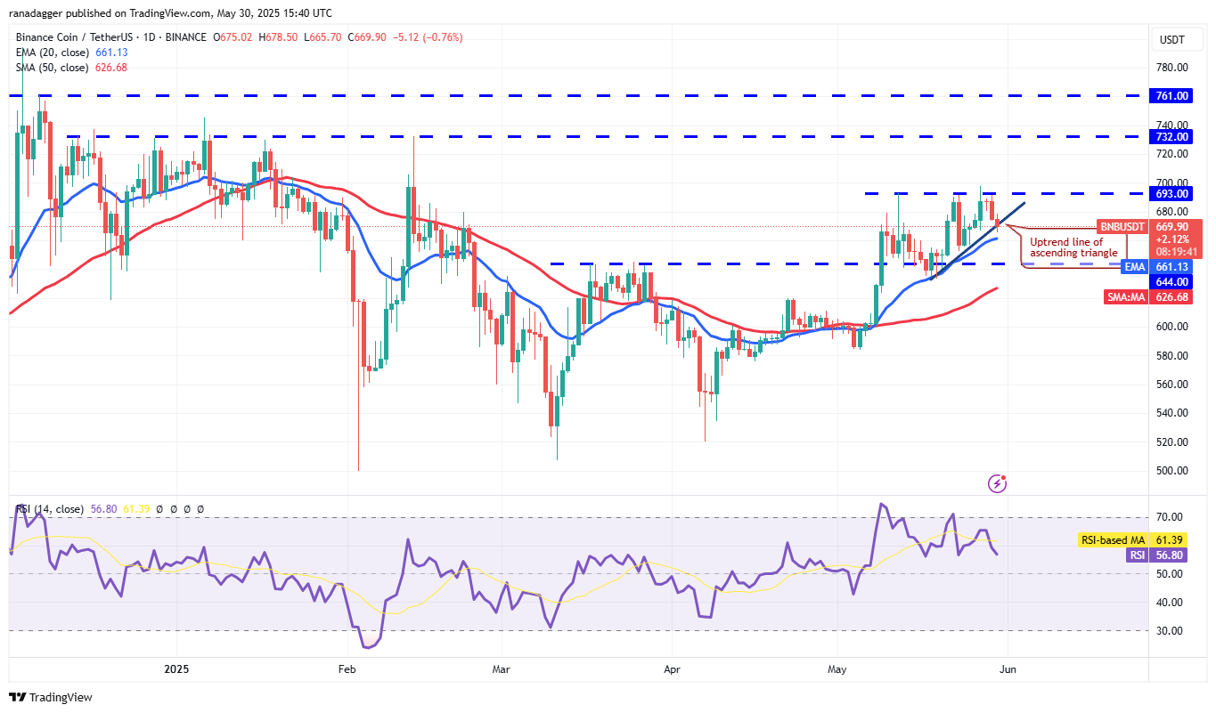 Buyers failed to kick BNB (BNB) above the $693 resistance on May 29, resulting in a pullback to the uptrend line.