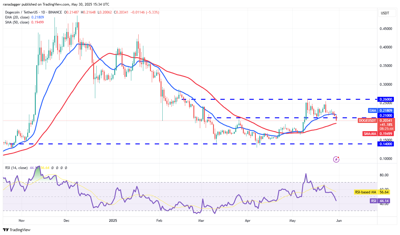 Dogecoin (DOGE) plunged below the $0.21 support on May 30, bringing the large $0.26 to $0.14 range into play.