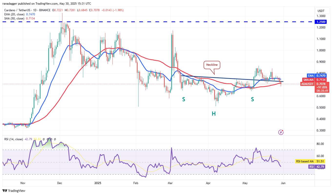 Cardano (ADA) fell below the neckline of the inverse Head and Shoulders (H&S) pattern on May 29, and the bears pulled the price below the 50-day SMA ($0.71) on May 30.