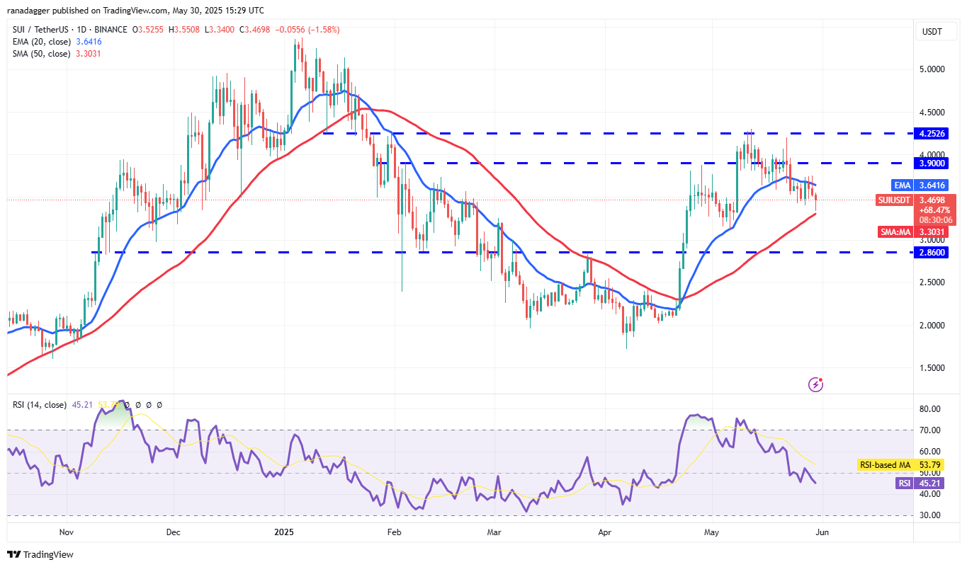 Sui (SUI) has bounced off the 50-day SMA ($3.30) on May 30, indicating that lower levels continue to attract buyers.