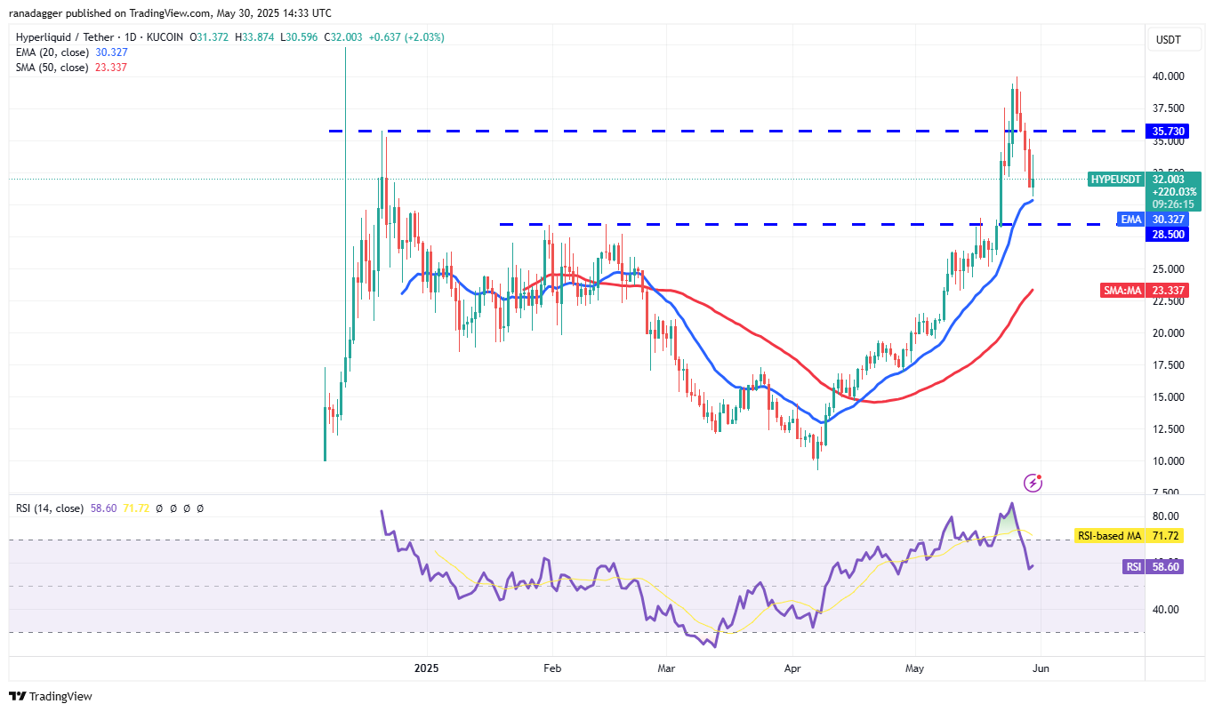 Hyperliquid (HYPE) is attempting to bounce off the 20-day EMA ($30.32), but the long wick on the candlestick signals selling on rallies.