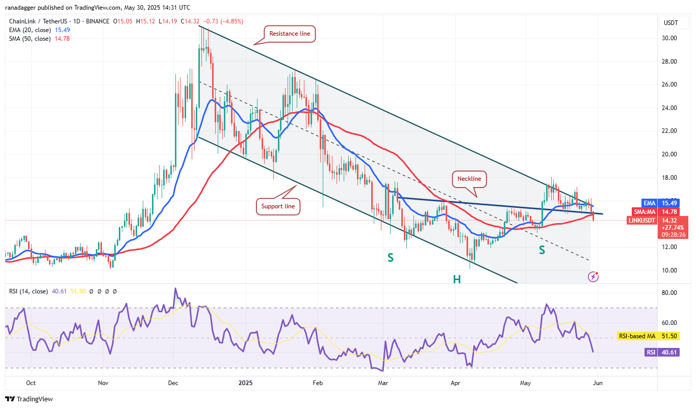 The bears are trying to sustain the price below the neckline of the inverse H&S pattern. If they succeed, it suggests that the markets have rejected the breakout from the bullish setup. That could sink the LINK/USDT pair to $13.20, extending the stay inside the descending channel pattern for some more time.