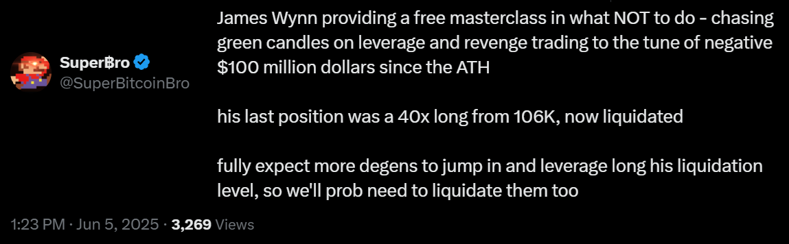 According to some analysts, including X user SuperBitcoinBro, the drop to $100,430 on June 5 was mainly triggered by excessive bullish leverage from “degenerate” traders. These leveraged bets followed the liquidation of a large position held by the so-called Hyperliquid whale near $104,000.