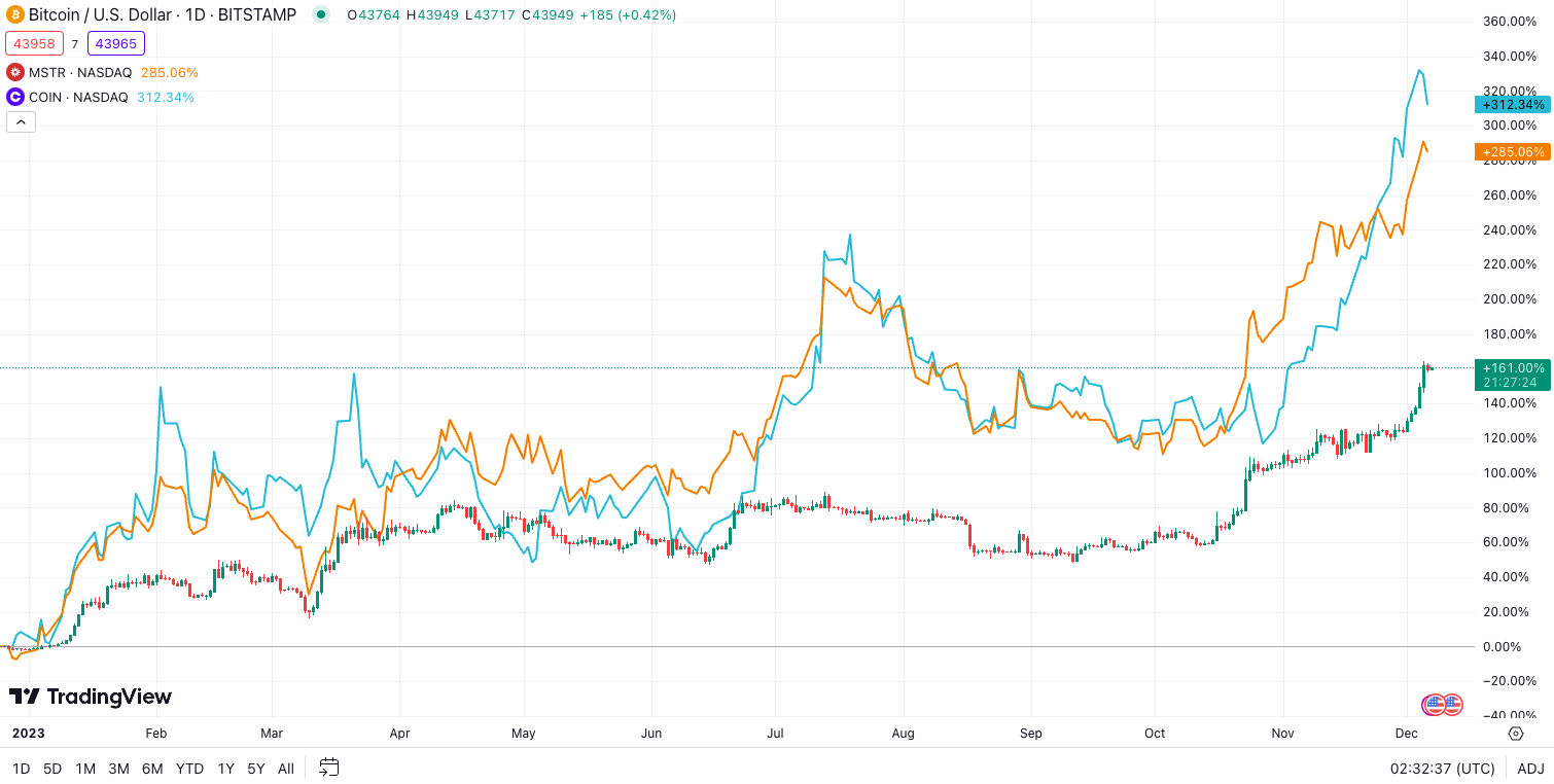 Bitcoin’s 161% year-to-date rally has been a significant driver for crypto firm share prices, with Coinbase and MicroStrategy growing 312% and 285%, respectively, within the same time frame.