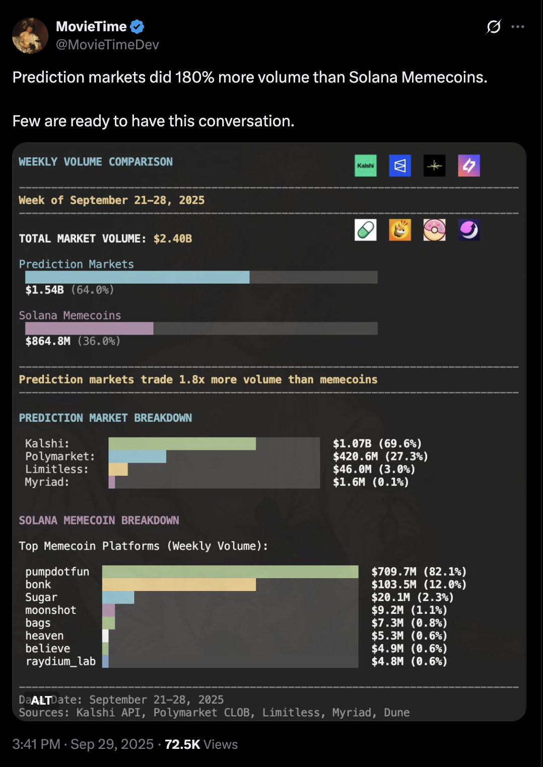It shows that Solana memecoins handled $864.8 million in volume during the week of Sept. 21–28, compared with $1.54 billion across prediction platforms such as Polymarket and Kalshi.
