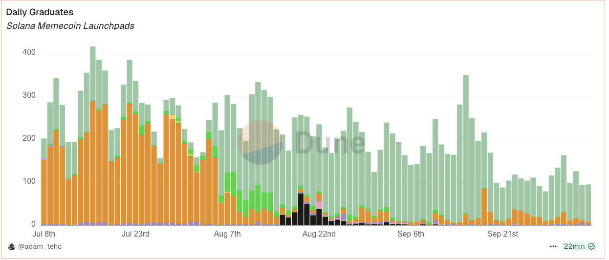 The number of new memecoins graduating from Solana-based launchpads has dropped sharply since July, according to data from Dune Analytics.